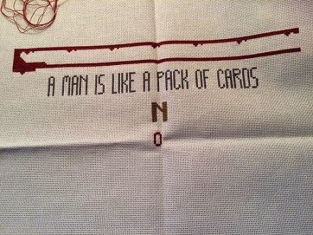All the cross stitches and half cross stitches are done - back stitch, long stitch, satin stitch, Lazy Daisy, Elongated Smyrna, French knots and beads still to come. All the capital letters have vines and leaves twined through them - that will be my focus next so all the letters will be completely finished.